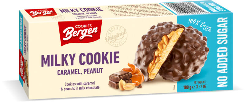 Bergen milky cookie karamellával tejcsokoládéban hozzáadott cukor nélkül 100 g