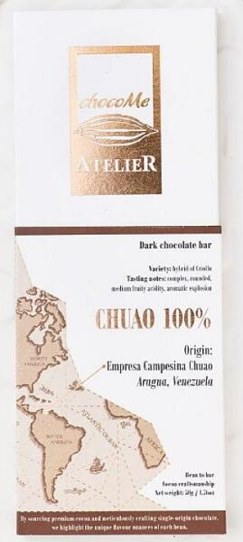 A chocoMe Atelier bean-to-bar kollekciója egy új, különleges taggal bővül: mostantól elérhető a 100% kakaótartalmú étcsokoládé, amely kizárólag a legendás Chuao termőhelyéről származó, különleges aromaprofillal rendelkező kakaóbabból készül. A Venezuelában található Chuao a világ egyik legismertebb és legelismertebb terroirja a kakaóbab termelésben, különleges mikroklímájának és hagyományos fermentálási és szárítási eljárásainak köszönhetően kivételesen komplex és gazdag ízvilágú babokat ad. A chocoMe által kézzel készített 100%-os bean-to-bar csokoládé kizárólag Chuao kakaóbabból készül, hozzáadott cukor vagy más összetevő nélkül – mégis meglepően könnyen fogyasztható, kerek, kiegyensúlyozott ízélményt kínál. Az intenzív kakaós jegyek mellett aszalt gyümölcsökre, fűszerekre és enyhe virágos árnyalatokra emlékeztető aromák bontakoznak ki, hosszú, tiszta lecsengéssel.