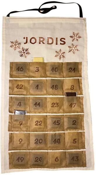 A Jordis Adventi naptár 24 ostyát tartalmaz (4 g tej, ét, fehér csokoládé) celofán zacskóba csomagolva.
