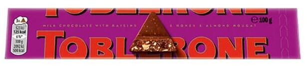 Toblerone gyümölcs és dió 100g Tejcsokoládé mazsolával és mézes-mandulás nugáttal Összetevők: cukor, mazsola (14,0%), teljes tejpor , kakaóvaj, kakaómassza, méz (3,0%), tejzsír , mandula (1,6%), emulgeálószer ( szójalecitin ), tojásfehérje , aroma. Tápértékek 100 grammonként: Energia 2092 kJ/500 kcal. Zsírok 25 g Ebből 15g telített. Szénhidrát 62g Ebből 61 g cukor. Rost 2,6 g. Fehérje 5,3 g. Só 0,12 g. Az EU-ban készült.