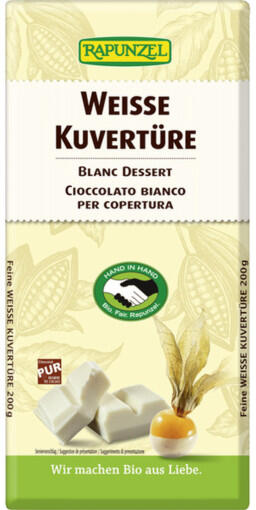 Rapunzel Fehér bevonó csokoládé BIO 200 g A puha pralinék, az édes gyümölcsök vagy a finom sütemények csak fele olyan finomak lennének, ha nem borítaná őket lágyan olvadó, bársonyos csokoládémáz. A csodálatosan aromás kakaóvaj és a teljes tej egy csipetnyi Bourbon vaníliával finomítja süteményeit vagy pralinéit. A csokoládébevonó fair trade kakaóból és cukorból készül, és a Rapunzel HAND IN HAND termékcsaládhoz tartozik. Használat