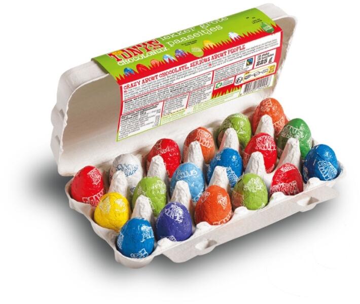 TONY'S CHOCOLONELY - Húsvéti tojások, Mix 18 db, 225 g. Belgiai fairtrade étcsokoládé, sötét tejcsokoládé, tejcsokoládé és fehér csokoládé húsvéti tojások, különböző ízesítésekkel: mogyoró darabok, nugát, karamell, málna, pattogó cukor, perec, mandula és tengeri só. Kiváló minőségű belga csokoládéból készült. Kakaó tartalom: étcsokoládé legalább 51 %, sötét csokoládé legalább 42 %, tejcsokoládé legalább 32 %, fehér csokoládé legalább 28 %. Összetevők: Étcsokoládé : kakaómassza, cukor, kakaóvaj, emulgeálószer: szójalecitin Tejcsokoládé : cukor, teljes tejpor, kakaóvaj, kakaómassza, emulgeálószer: szójalecitin Tejcsokoládé, karamell és tengeri só: cukor, teljes tejpor, kakaóvaj, kakaómassza, karamell darabkák 10 % (cukor, glükózszirup, tejszín, vaj), tengeri só 0,5 %, emulgeálószer: szójalecitin Fehér csokoládé : cukor, kakaóvaj, teljes tejpor, emulgeálószer: szójalecitin Tejcsokoládé, mogyoró : cukor, teljes tejpor, kakaóvaj, kakaómassza, mogyoró 10 %, emulgeálószer: szójalecitin Tejcsokoládé, nugát: cukor, teljes tejpor, kakaóvaj, kakaómassza, nugát 10 % (nyers cukor, glükózszirup, mandula, burgonyakemikál, méz, kakaóvaj, tojásfehérje), emulgeálószer: szójalecitin Tej és sötét csokoládé : cukor, kakaómassza, teljes tejpor, kakaóvaj, emulgeálószer: szójalecitin Étcsokoládé, mandula és tengeri só : kakaómassza, cukor, mandula 10 %, kakaóvaj, tengeri só 0,5 %, emulgeálószer: szójalecitin Tartalmazhat glutént.